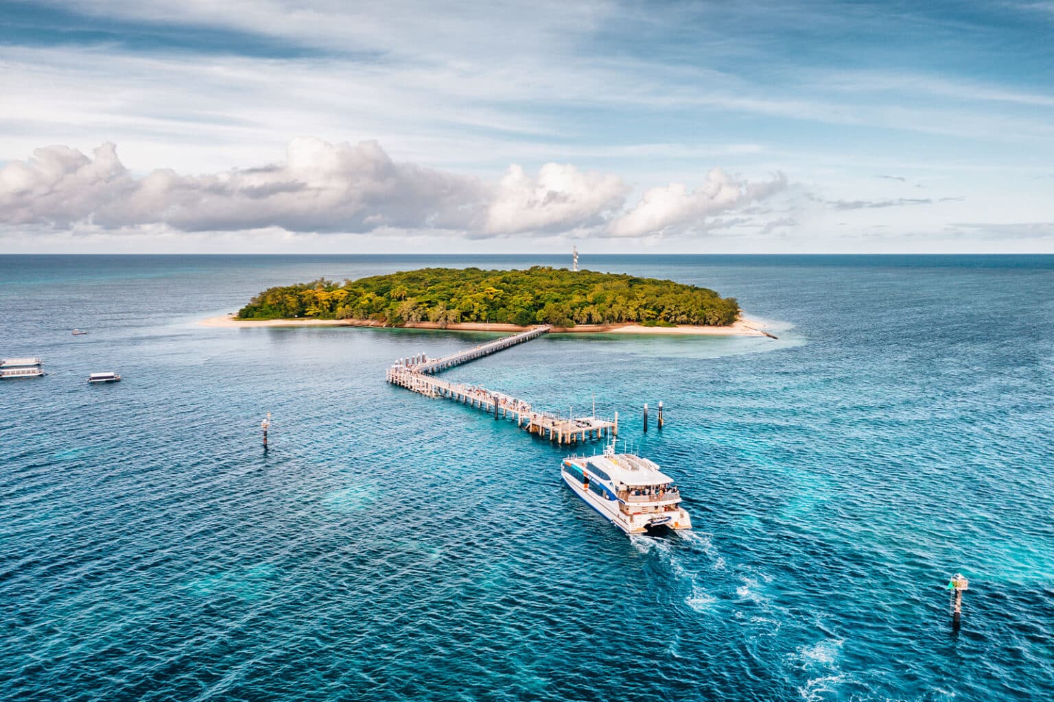 Aerial view of Green Island with the Great Adventures catamaran arriving at the jetty on the Great Barrier Reef.