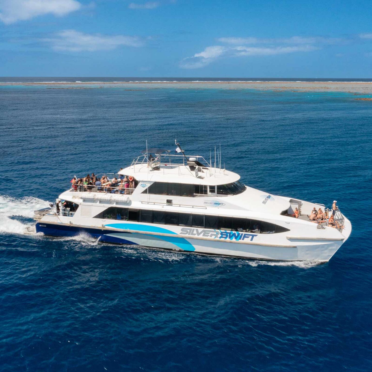 Silverswift dive and snorkel boat travelling to the outer Great Barrier Reef from Cairns